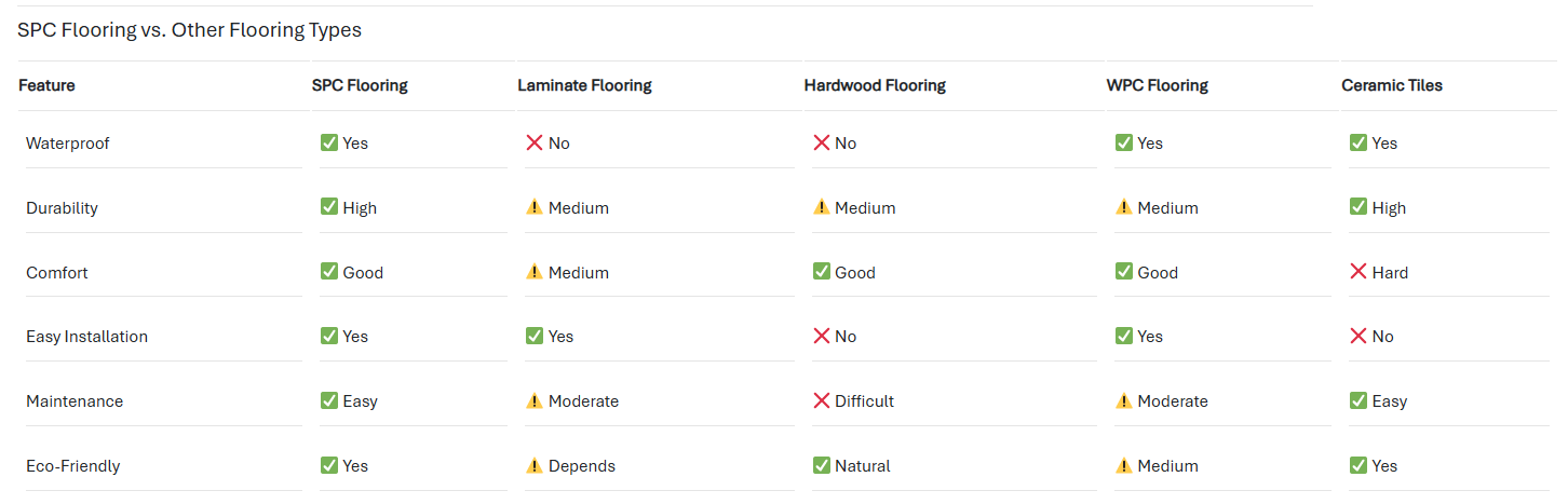 Compared to laminate and hardwood, SPC flooring offers better durability and moisture resistance, while being easier to install and maintain.